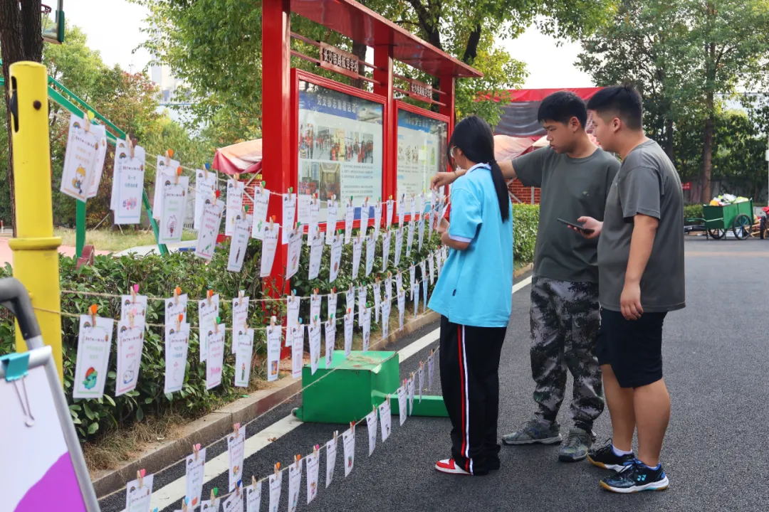 操场另一侧,“爱自己的100种方式”展览吸引了众多师生的目光。麻绳上挂满了夹子,每个夹子上都夹着一张打印纸,上面写满了爱自己的小方法。学生们驻足观看,有的点头赞同,有的若有所思。